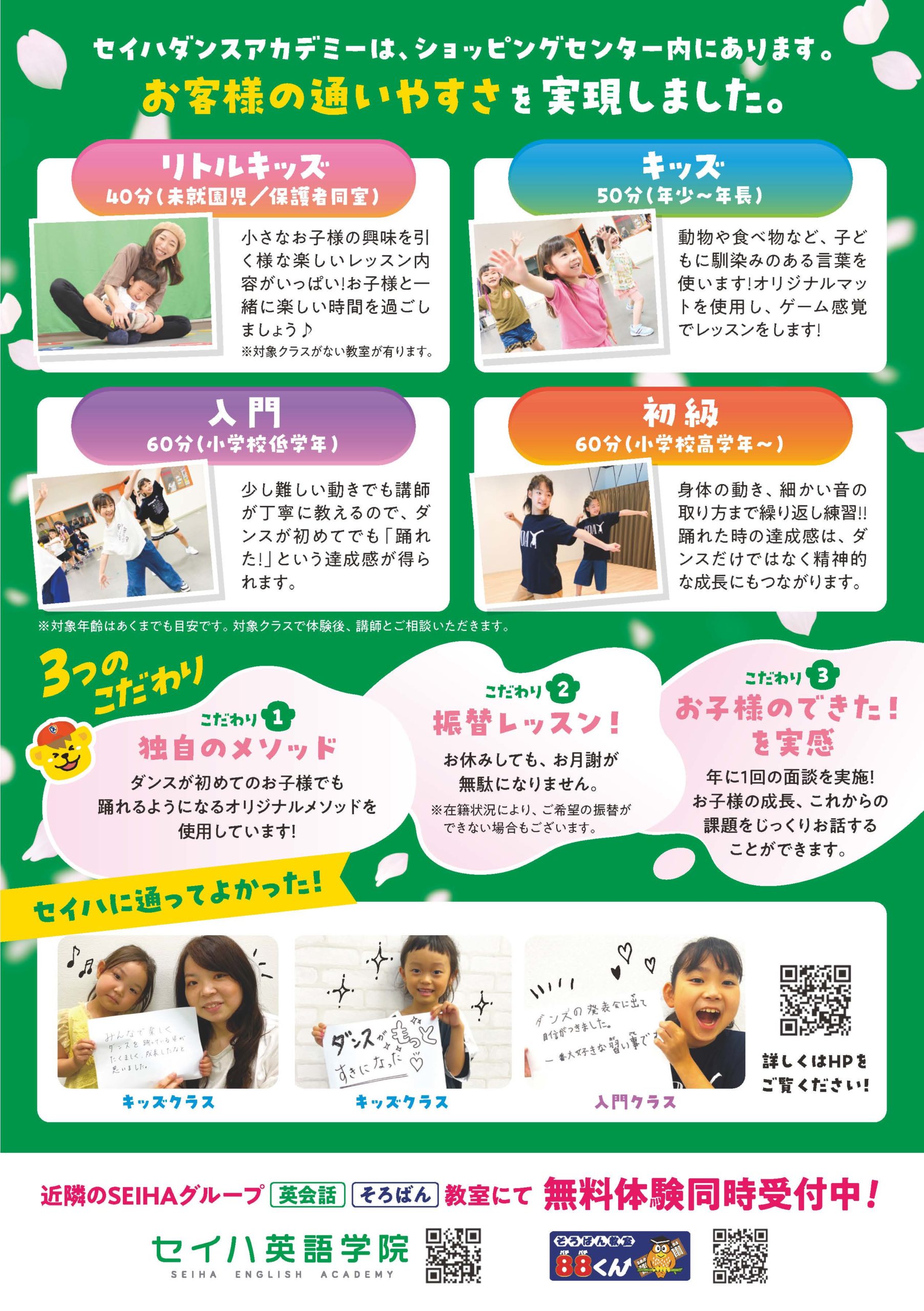 セイハダンスアカデミーのお教室 イオンスタイル南砂3Fという店内に教室があるので、お子様がレッスン中はお買い物ができたりと便利です。 また大きな窓があるのでそこからレッスン風景をのぞいていただいてもOK!お子様も保護者様も安心して通えるスクールです。 |