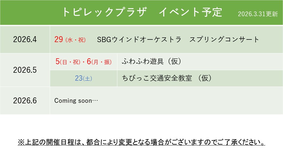 【参加無料】3月28日(土)に「ふれあい動物園」を開催します! <開催場所> トピレックプラザ イオン館屋上駐車場 <開催時間> 2026年3月28日(土) 10:30~16:30 ※動物の健康管理上、開催時間中に休憩時間を頂きます。 動物の休憩中はふれあいが出来ませんのでご了承ください。 <開催内容> ふれあい可能な動物:ウサギ、ヒヨコ、ヤギ、ヒツジ、アヒル ほか ※今回の開催では、ポニー乗馬体験はありません。 <ご注意> 当日の天候等に...