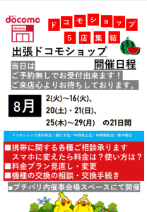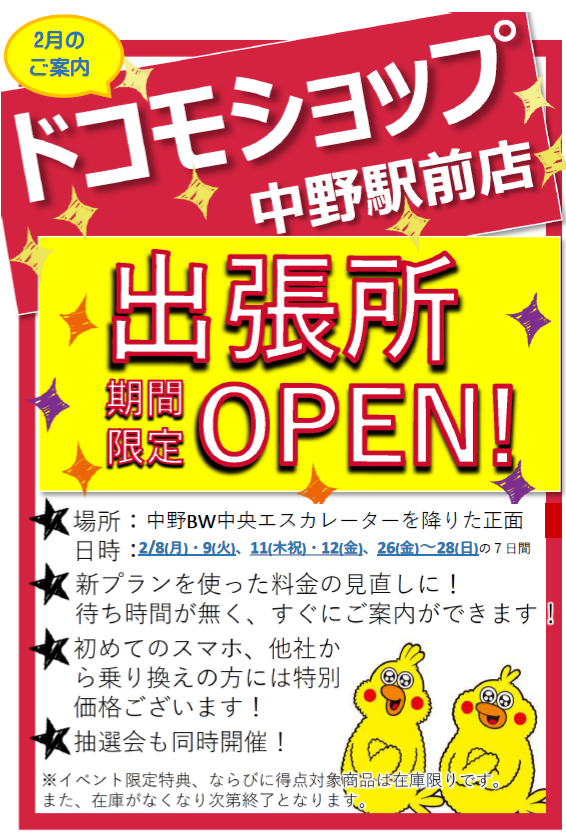 HOME > イベント&ニュース > イベント > イベント イベント&ニュース ドコモショップ8月のお知らせ 2022/07/22 8月も「ドコモショップ」が中野ブロードウェイにて出張営業をいたします。 いつでも安心してご利用いただけるスマホを目指して 中野ブロードウェイでお待ちしております。 ●名称:ドコモショップ出張所 in 中野ブロードウェイ ●日程:2022年8/2(火)~8/16(火)、8/20(土)・21(日)、8/25(木)~8/29(月) ●場所:東京都中野区中野5-52-15 中野ブロードウェイ地下プチパリ内 (ビル中央のエスカレーターを降りた正面、または左手の会場です) -イベント, イベント&ニュース
