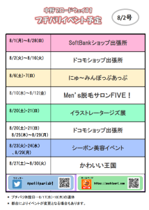 HOME > イベント&ニュース > イベント > イベント イベント&ニュース プチパリ イベント情報(8/2号) 2022/07/31 8月も初出店の「ハンドメイドショップ」「美容サロン」など 楽しみにしていてください!! -イベント, イベント&ニュース
