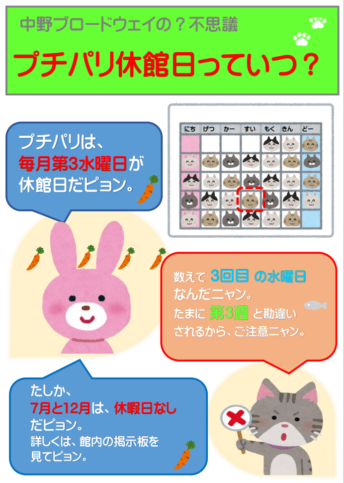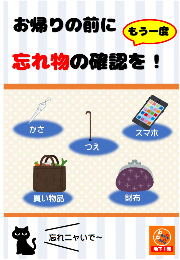 HOME > イベント&ニュース > ニュース > イベント&ニュース ニュース お忘れ物のご注意! 2021/05/02 最近、中野ブロードウェイ、B1プチパリにて「お忘れ物の問い合わせ」が増えております。 緊急事態宣言中のお買い物では、何かと急かされてしまいがちですが、 お帰りの前にもう一度「お忘れ物のご確認」をお願いいたします。 <お忘れ物の例>●暑い日…上着、ハンカチ。●雨の日…傘、杖。●たくさん買い物をした日…購入商品、財布、スマホ、鍵。 -イベント&ニュース, ニュース