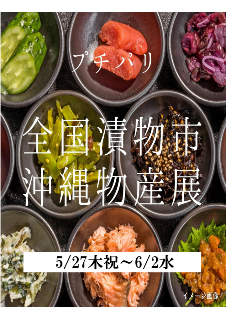 HOME > イベント&ニュース > イベント > イベント イベント&ニュース 全国漬物市&沖縄物産展 5/27-6/2【中止】 2021/05/16 【5/22追記】 このイベントは都合により中止となりました。 楽しみにされていたお客様には大変申し訳ございません。 恒例の「全国漬物市」が帰って来ます。 おうちご飯が定番化して来た昨今、旅行にも行けず、悶々とする日々が続いていますが、 たまには美味しい漬物などいかがですか? ■日時:2021年5/27(木祝)~6/2(水) の7日間■中野ブロードウェイ地下プチパリ内「催事会場」 (ビル中央エスカレーターを降りた正面です) -イベント, イベント&ニュース