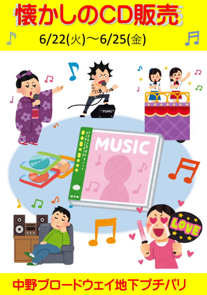 HOME > イベント&ニュース > イベント > イベント イベント&ニュース 懐かしのCD販売 6/22(火)~6/25(金) 2021/06/06 中野ブロードウェイに「懐かしのCD販売フェア」が4日間限定でOPEN!! 昭和・平成時代の思い出の演歌・歌謡曲・アイドルソングを おうち時間を使ってゆっくり味わってください。 ●日時:2021年6/22(火)~6/25(金) の4日間●場所:中野ブロードウェイ地下プチパリ内 (ビル中央エスカレーターを降りた正面の会場) -イベント, イベント&ニュース