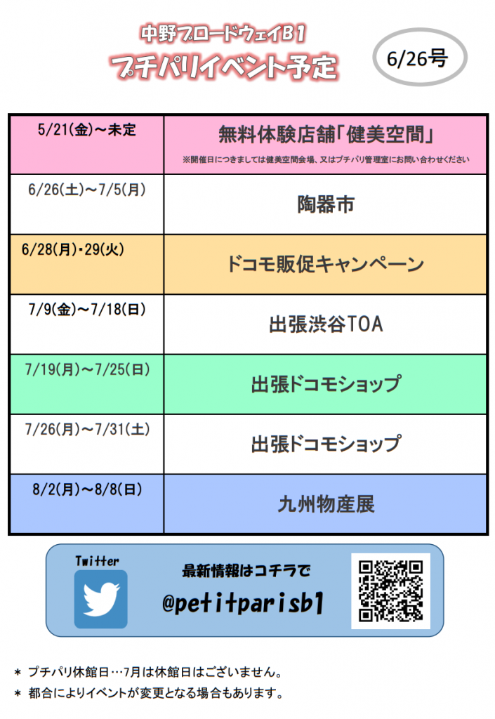 HOME > イベント&ニュース > イベント > イベント イベント&ニュース プチパリ・イベント情報 6/26 2021/06/26 開催場所:中野ブロードウェイ地下「プチパリ」 (ビル中央エスカレーターを降りた正面の特設会場) *「健美空間」は会場の向かいにあります。 -イベント, イベント&ニュース