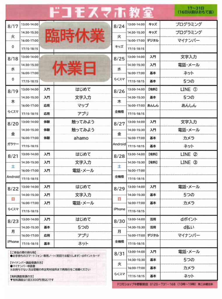 ドコモショップ中野駅前店では、ほぼ毎日「無料のスマホ教室」を開催しています。(一部、有料口座あり)