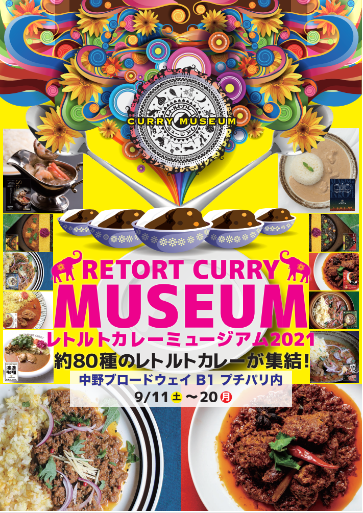 HOME > イベント&ニュース > イベント > イベント イベント&ニュース レトルトカレーミュージアム再臨 2021/09/06 春の出展で大好評を頂きました「レトルトカレーミュージアムin中野」が 再び中野ブロードウェイへやって来ます!! 前回、完売で買えなかったカレーをゲットするチャンスです。 ●日程:2021年9/11(土)~9/20(日)の9日間 *9/15(水)はプチパリの休館日●場所:中野区中野5-52-15 中野ブロードウェイ地下プチパリ (ビル中央エスカレーターを降りた正面の会場) -イベント, イベント&ニュース