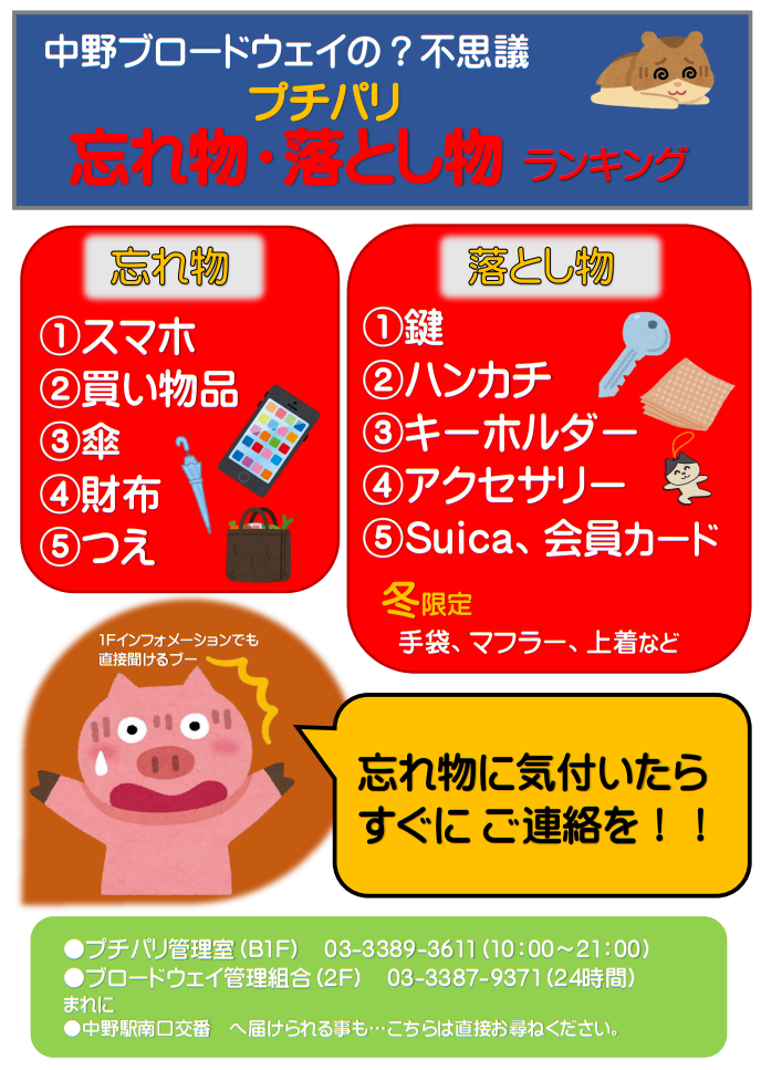 HOME > イベント&ニュース > ニュース > イベント&ニュース ニュース プチパリからのお知らせ【忘れ物】 2021/09/12 プチパリに届きます「忘れ物・落とし物」のランキングをご報告します。 これらは一定期間保管の後、「スマホ・お財布・カード類」は交番へ。 「衣類・小物・雑誌類」は処分させて頂いております。 特に「傘・杖など」は有料の粗大ゴミ扱いとなり、プチパリ商店会の負担で処分しています。 少し前までは、皆様の大切な持ち物だったはずです。きっと見つからないと諦めずに まずはご連絡ください。 プチパリ商店会一同 -イベント&ニュース, ニュース